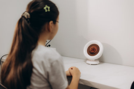 The girl, worried about the constant lack of heating, sits by the heater.