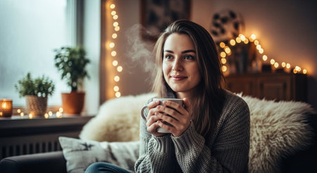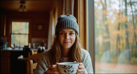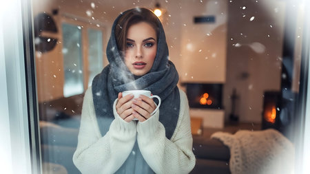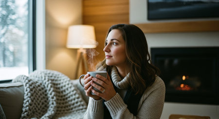 A woman sitting by a cozy fireplace, holding a cup of steaming beverage, looking thoughtfully out of a window, with a warm and inviting interior