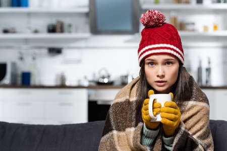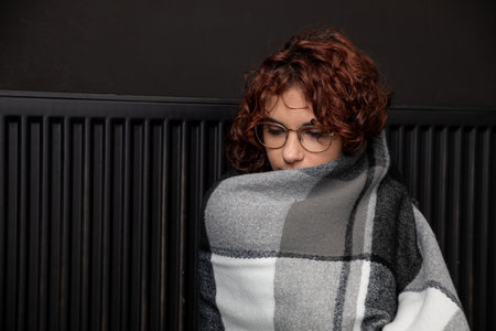 Worried sad woman sits under blanket near heating radiator with cup of tea, Rising costs in private households for gas bill due to inflation and war, Energy crisis