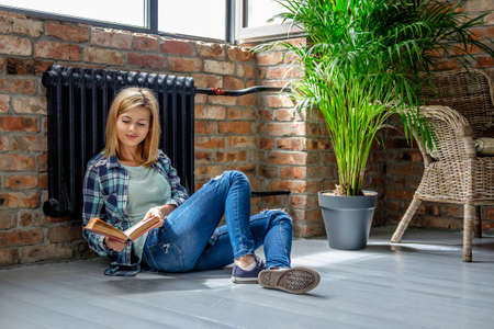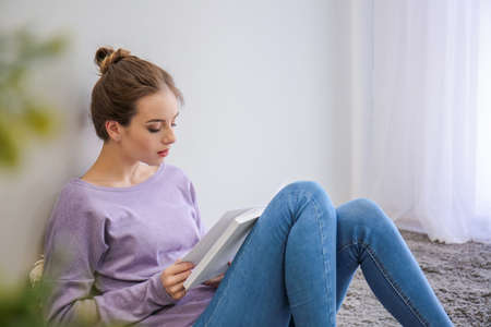 Attractive casual blond female sitting on the floor and reading a book in living room.