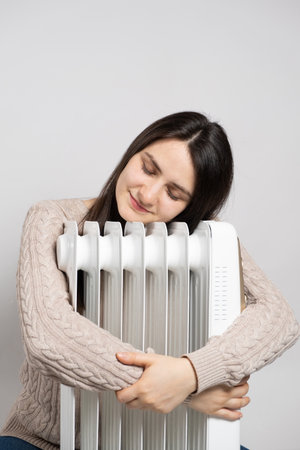 A brunette woman hugs an electric oil heater, warms up in winter.