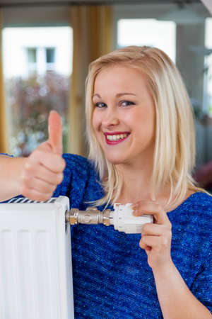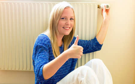 for saving energy and reducing power, a young woman, the temperature in the living room