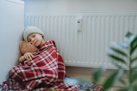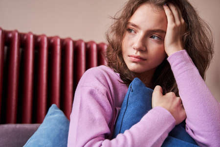 Sad girl sitting near heater. Children depression.