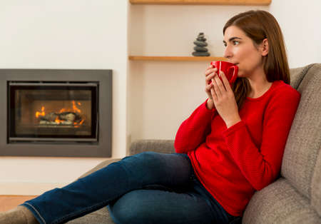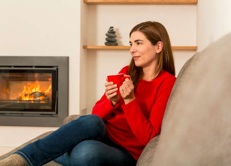 Beautiful woman at home drinking a coffee at the fireplace