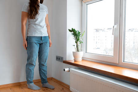 Young woman standing near the window and warming her hands on the radiator