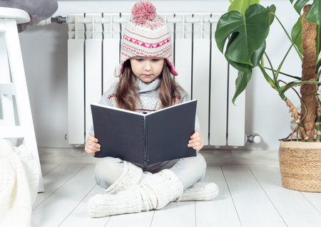 Serious, cute, concentrated little girl in knitted hat and warm clothes reading, exploring book next to heating radiator, near plant in white room. Explore and research of notebook or sketchbook
