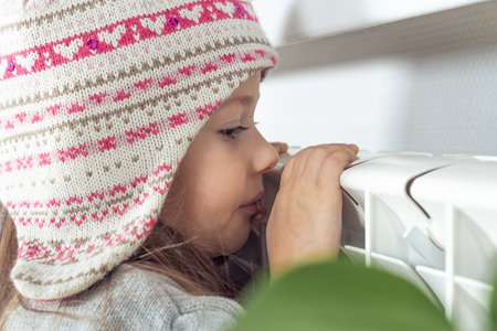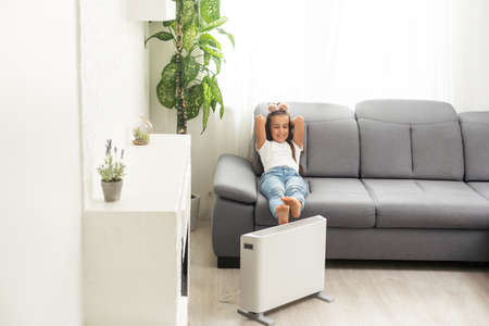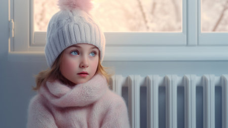Little girl in warm sweater sitting by window and warming up from the heating radiator. Heating in an apartment, at home. High quality photo
