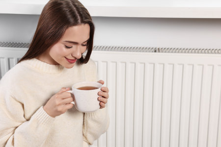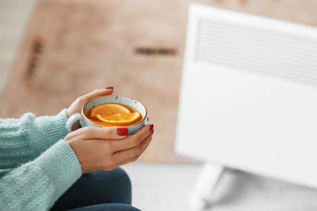 Woman drinking hot tea at home. Concept of heating season