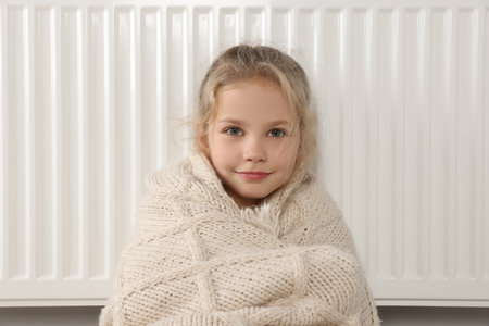 Depressed, cried, serious little girl wrapped in warm plaid, trying warming up, keep warm with woolen clothes, sit on the floor near heating radiator in apartment. Broken convector, suffer from cold
