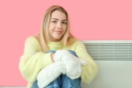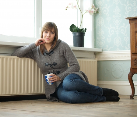 a young woman sits in front of a radiator in the winter
