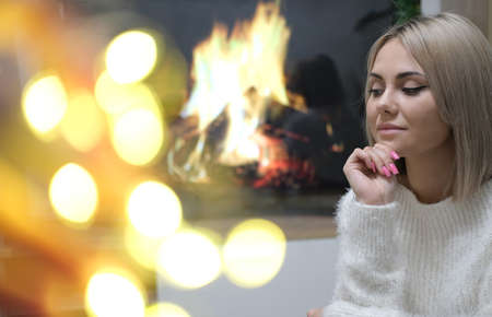 Portrait of a beautiful girl with blond hair in front of a fireplace. She dreams of gifts for Christmas and New Year