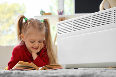 Cute little girl reading book near radiator at home