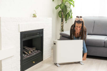 a woman is warming herself at the radiator in a cold house, problems with heating, heating the room with an electric convector