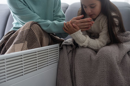 Mother and child warming hands near electric heater at home, closeup.