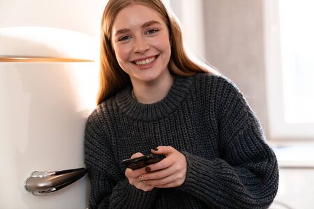 happy young woman in white sweater and skirt at modern home in sunny winter day near warm white electric oil radiator.