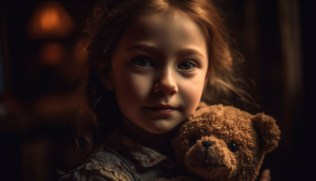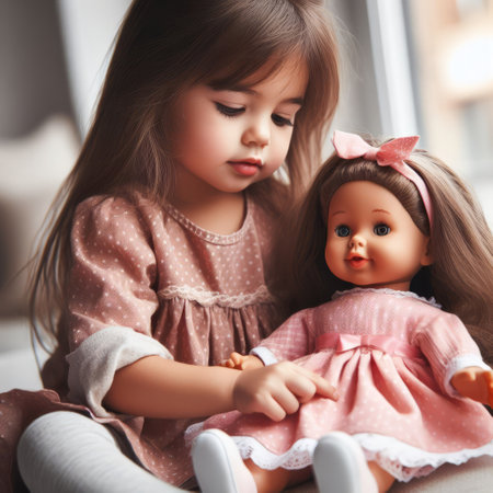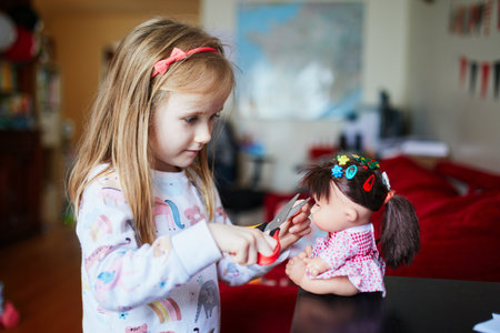 Adorable preschooler girl playing house at home. Child making haircut to her doll. Indoor creative activities for kids