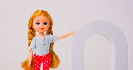 A cheerful toy doll with blonde hair and braided pigtails poses beside a white arch in a bright indoor space. The doll wears a casual outfit with red polka-dotted shorts.