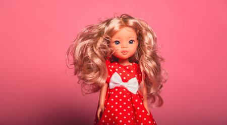 Doll with long curly hair wearing a red outfit with white polka dots on a pink background