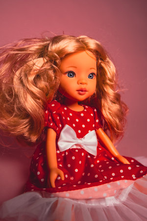 A doll with curly blonde hair sits on a pink background dressed in a red dress with white polka dots. The doll has blue eyes and a cheerful expression.