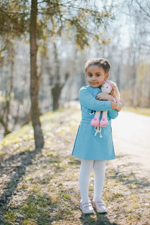 Close up of Little girl with doll at park with blurred green background