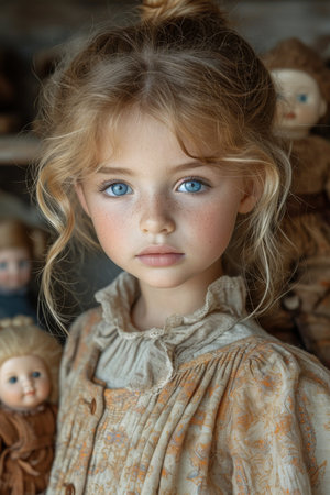 Amazing realistic vintage porcelain doll, toy with brown eyes, selective focus, antique shop concept, vintage market