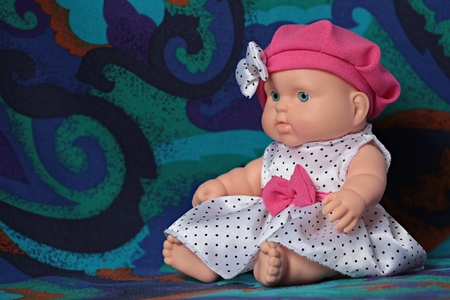 little doll baby in a beret with a bow macro shot