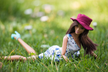 Mulhouse - France - 24 March 2022 - Portrait of brunette barbie doll wearing a blue dress lying in the grass