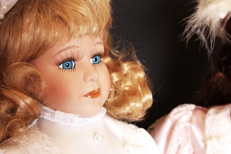 Beautiful doll. close up. Portrait of attractive toy's face with big eyes