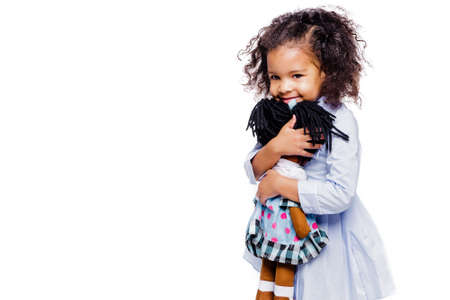 Happy Little Girl playing with baby doll on white background