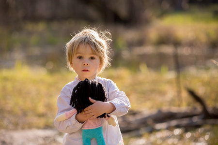 Little toddler blond child, boy, playing with handknitted doll in the park