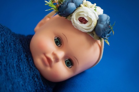 Baby doll toy photodraphed in a newborn style. Wrapped in dark blue woolen fabric on a blue background.