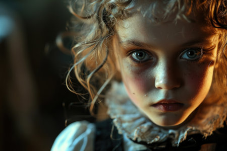 Scary vintage doll in half light. Close up