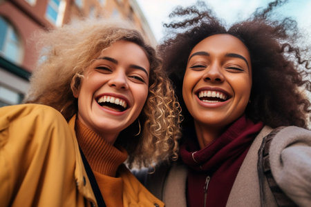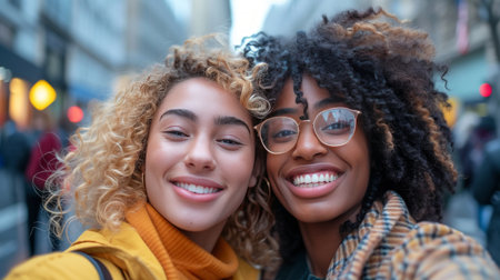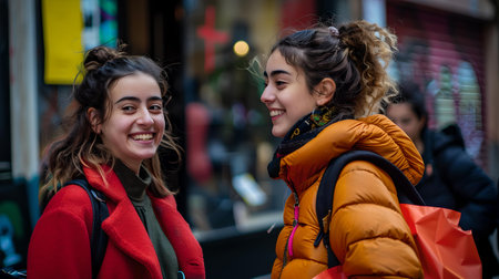 A candid shot of two smiling women in colorful jackets, exemplifying friendship and urban life. A.I.
