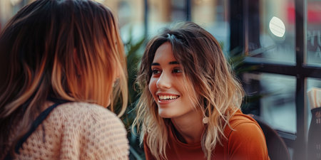 Portrait of two young women talking and smiling while sitting in cafe.