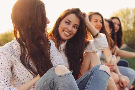 Group of young happy girls friends enjoy life on summer city street, sunset background