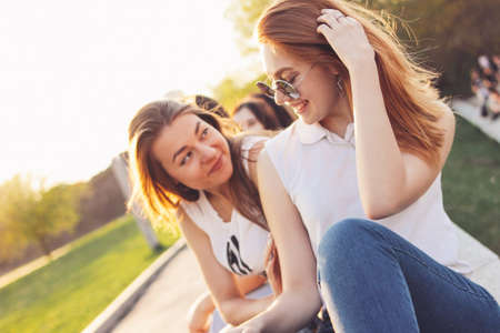 Two young girls friends sitting on a bench in summer park chatting happily having fun. Media. Portrait of two laughing women spend time together and hugging.