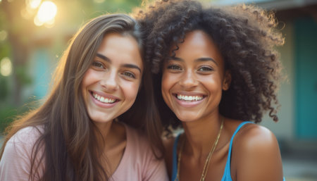 This vibrant image captures two young women, one with long brown hair and the other with beautiful curly hair, beaming with happiness. Their warm smiles and glowing expressions reflect a deep bond of friendship, set against a backdrop of soft sunlight filtering through greenery.