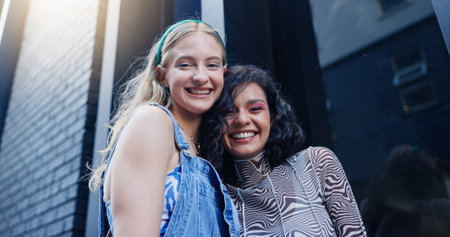 Friends, girls and portrait with fashion in city with streetwear style, trendy clothes and edgy outfit. Gen z, happy people and bonding with confidence, support and low angle on weekend break in town