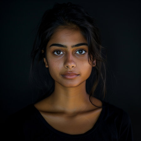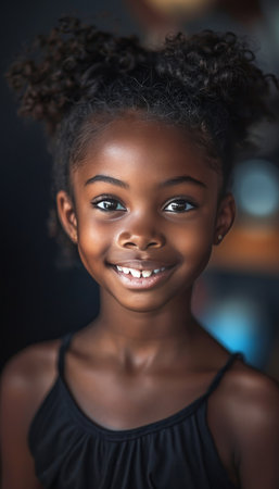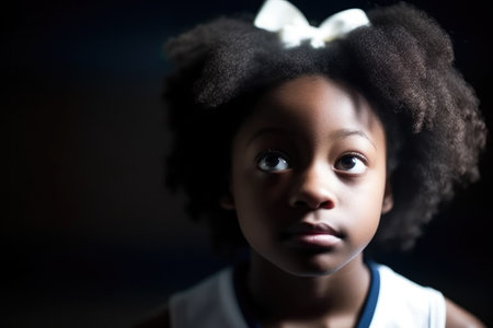 A young girl displays a calm expression with captivating eyes, framed by her textured hair. The dark background enhances her features and adds depth to the portrait.