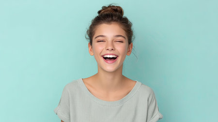 A closeup of young girl smiling brightly with shining eyes, radiating joy and happiness against soft turquoise background, creating cheerful and uplifting atmosphere