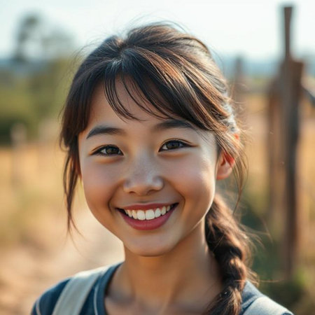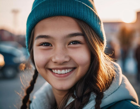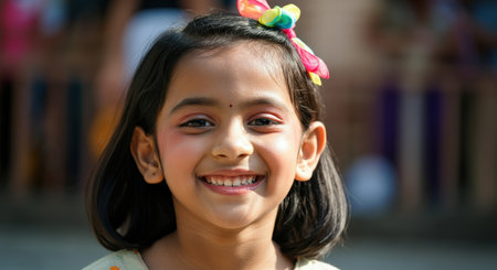 A delightful portrait of a young girl smiling brightly in an outdoor setting. Her joyful expression radiates happiness against a colorful background.