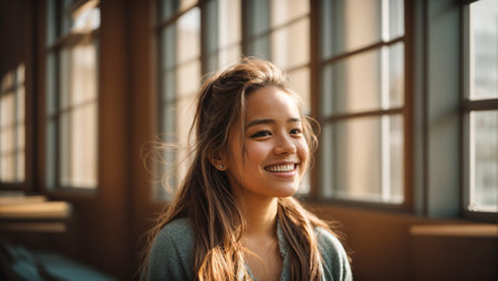 A captivating portrait of a young woman smiling with joy, showcasing her beauty and elegance through stylish accessories and soft lighting.