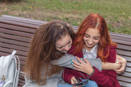 Female teenagers listening to music on smartphone sitting on the bench in an autumn city park