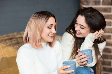Cheerful modern female friends with mugs drinking coffee ant chatting while enjoying time together sitting against gray wall