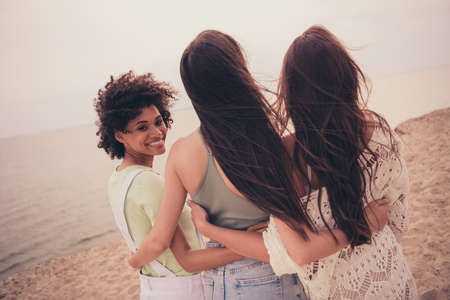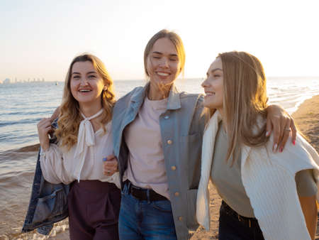 Three friends having fun on the beach, meeting friends. Young women in casual clothes walk on the beach at sunset