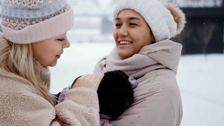 Two lovely women laugh and hug against the background of a snowy winter park. female friendship concept