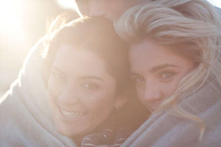 A closeup shot of a few girls hugging each other on the beach showing the girl's day concept