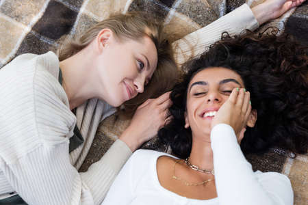 top view of cheerful lesbian couple lying on checkered blanket during picnic