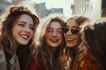 Three women are captured in a close embrace, laughing with genuine joy. The scene features natural lighting and a soft focus on their faces. The composition highlights their connection. Suitable for use in various projects that seek to convey friendship and happiness.