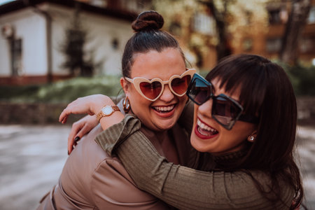 Two happy female friends are hugging and smiling outdoors, enjoying a sunny day together